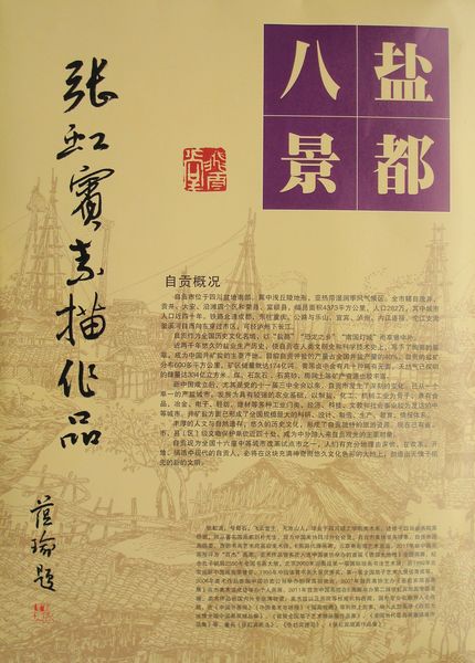 《盐都八景图》集中选取了全国历史文化名城、全国优秀旅游城市——盐都自贡的八个具有代表性的风景名胜作为创作对象。其中,有全国重点文物保护单位“西秦会馆、荣县大佛;”有再现盐文化场景的“燊海古井、盐场春秋;”有表现独具特色城中瀑布的贡井“平桥瀑布;”有展现古镇风情的“仙市古镇;”有表现才子之乡富顺优美景色的“荷塘西湖;”有凸显盐都特色的“釜溪春晓。”八幅作品,视角独特、笔触细腻、画面优美,极具历史的厚重感,又具有浓厚的生活气息。幅幅都是精品,堪称上乘之作。